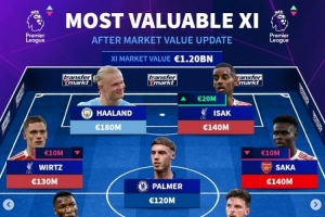 24体育直播:2025年10月18日讯 德转在本月17日更新英超球员身价,同时列出英超球员身价最贵阵,哈兰德、维尔茨、伊萨克在列,总身价达12亿欧。