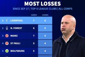 NBA直播10月30日讯 利物浦0-3不敌水晶宫,各项赛事仅7场比赛1胜6负,数据统计显示,利物浦是同一时期五大联赛所有球队中输球场次最多的。