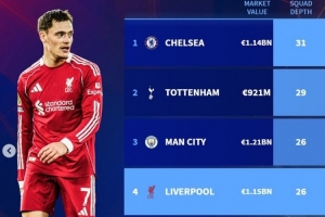NBA直播10月30日讯 利物浦在本轮联赛杯做出大轮换最终主场0-3完败水晶宫,斯洛特在赛后抱怨球队人手不足。《转会市场》则统计了BIG6的阵容深度情况。