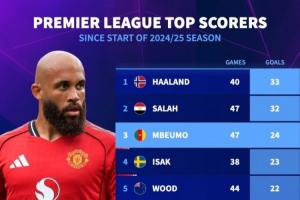 NBA直播10月31日讯 《转会市场》统计了上赛季至今的英超射手榜,哈兰德已经反超萨拉赫居首。