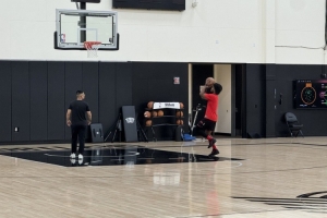 NBA直播10月21日讯 开拓者随队记者Sean Highkin晒照,开拓者后卫亨德森训练后单独进行了投篮练习,杨瀚森的翻译刘禹铖(克里斯)在旁边帮他捡篮板。