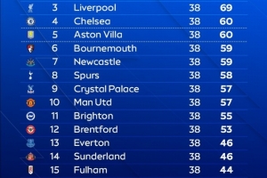 NBA直播10月31日讯 Opta数据给出了最新一期的2025/26赛季英超联赛最终排名预测,阿森纳夺冠。