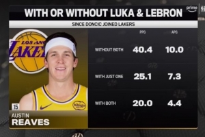 小里数据:无詹无东40.4分10助,有其中一人场均25.1分7.3助,有詹有东20分4.4助