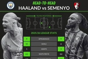 NBA直播11月3日讯 本轮英超,曼城将主场对阵伯恩茅斯。赛前WhoScored列出了两队主要得分手哈兰德和塞梅尼奥的数据对比。