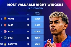 NBA直播11月3日讯 德转列当前世界足坛右边锋身价排行,亚马尔2亿欧居首,萨卡1.4亿欧第二,奥利塞1.3亿欧第三。