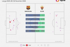 NBA直播11月3日讯 2025-26赛季西甲第11轮,埃尔切客场1-3不敌巴萨。本场比赛,埃尔切控球率达到了51%。