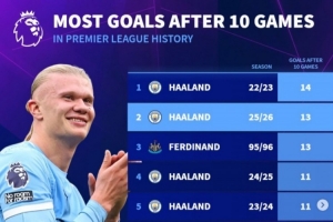 NBA直播11月3日讯 本赛季英超10轮过后,曼城前锋哈兰德已经打进了13球,据德转统计,在联赛历史各赛季前10轮进球榜中,这一进球数排在第二位。