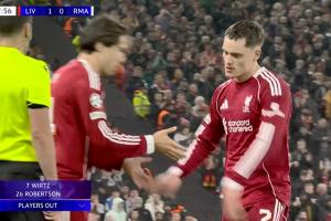 NBA直播11月05日讯 欧冠第4轮利物浦vs皇马第89分钟,利物浦再次做出2个换人调整,维尔茨、罗伯逊被换下,凯尔凯兹、基耶萨替补登场。