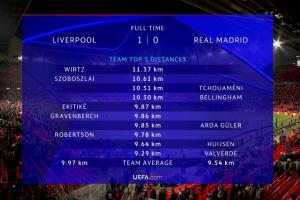 NBA直播11月05日讯 利物浦本轮欧冠1-0击败皇马。赛后官方跑动数据出炉。