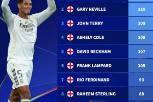 NBA直播11月5日讯 在本轮欧冠,利物浦1-0击败皇马。贝林厄姆完成生涯50场欧冠里程碑,德转也盘点了英格兰球员欧冠出场次数榜,具体如下: