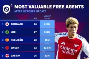NBA直播10月21日讯 德转更新自由球员身价排行榜,富安健洋1600万欧居首,雷吉隆、齐耶赫、帕科位居前十位。
