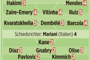 NBA直播11月5日讯 巴黎在本轮欧冠焦点战主场1-2不敌拜仁,马尔基尼奥斯送礼、迪亚斯双响后染红,《图片报》在赛后为两队进行了评分:(1分最佳、5分最差,6分相当于负分)
