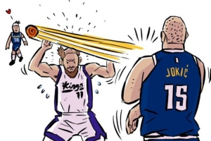 NBA直播11月6日讯 在之前掘金对阵国王的比赛中,约基奇贴着多曼塔斯·萨博尼斯头皮传球的一幕,被漫画家Jay Kim创作出一幅搞笑漫画。