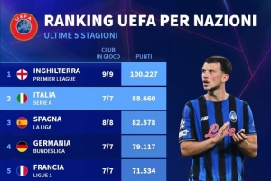 NBA直播11月6日讯 德国转会市场列出了各国联赛的欧战总积分排名,英超居首,意甲、西甲二三位。