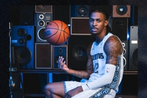 新款球衣由莫兰特、杰罗姆还有波普上身示范。