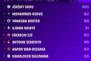 NBA直播11月10日讯 英超第11轮比赛,多库完成7次过人,打进1球,帮助曼城3-0击败利物浦。据Squawka统计,多库是2025年首位英超成功过人达到100次的球员。