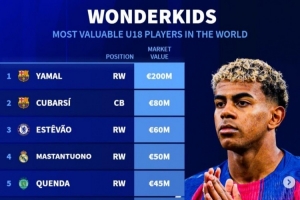 NBA直播11月10日讯 《转会市场》统计了当前世界足坛U18球员身价情况,亚马尔无悬念2亿欧独自领跑。