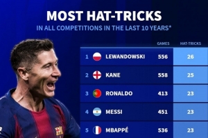 近10年戴帽次数排名(前十联赛+杯赛+国家队):