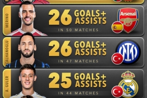 NBA直播11月10日讯 Score90统计了2025年五大联赛中场球员在俱乐部+国家队比赛中参与进球的数量,并列出榜单。