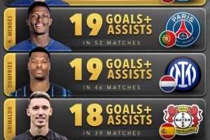 NBA直播11月10日讯 Score90统计了2025年五大联赛后卫在俱乐部+国家队比赛中参与进球的数量,并列出榜单。