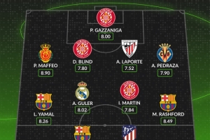 NBA直播11月10日讯 WhoScored列出了西甲第12轮最佳阵容,莱万、拉什福德、亚马尔、阿尔瓦雷斯、居莱尔在列。