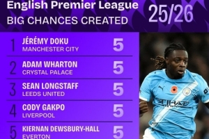 NBA直播11月11日讯 英超联赛已经进行了11轮,squakwa也统计了本赛季英超创造重大机会情况,多达8人并列居首。
