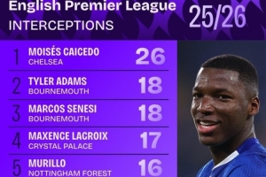 本赛季英超拦截榜: