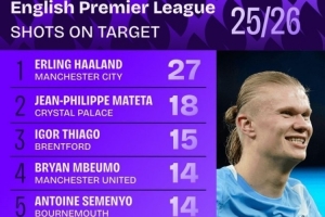 NBA直播11月11日讯 英超联赛已经进行了11轮,squakwa也统计了本赛季英超射正次数,哈兰德断崖领跑。