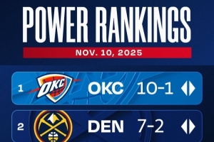 NBA直播11月11日讯 官方发布了最新一期球队战力榜,其中前两名没有变化,依旧是雷霆和掘金。而火箭升至了第三位,尼克斯也升到了第四位。