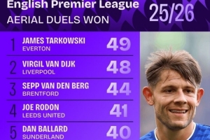NBA直播11月11日讯 英超联赛已经进行了11轮,squakwa也统计了本赛季英超空中成功对抗次数,塔科夫斯基力压范戴克居首。
