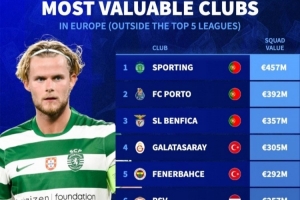 NBA直播11月11日讯 德国转会市场盘点了五大联赛之外的欧洲球队身价,葡萄牙体育4.57亿欧元排名第一。