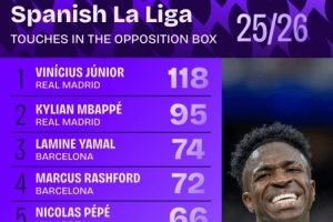 NBA直播11月12日讯 本赛季西甲进行了12轮比赛,Squawka统计了在对方禁区内触球次数榜,维尼修斯118次居首,姆巴佩、亚马尔二三位。