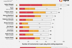 NBA直播11月12日讯 据Opta统计,姆巴佩本赛季联赛参与106次以射门终结的进攻,西甲球员中最多。