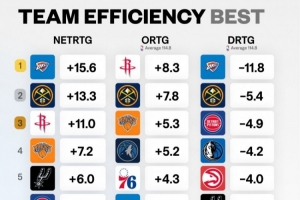 NBA直播11月14日讯 美媒Basketball University发布了赛季至今的各队净效率、进攻效率以及防守效率前十的帮当。其中雷霆净效率+15.6排名第一,进攻效率火箭+8.3排名第一,防守效率雷霆-11.8排名第一。