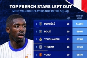 NBA直播11月14日讯 德国转会市场统计了无缘本期法国队名单球员的身价,并列出榜单,登贝莱1亿欧居首。