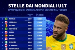 NBA直播11月15日讯 德转列出了曾参加U17世界杯球员最高身价排名,内马尔1.8亿欧居首,斯特林1.6亿欧次席。