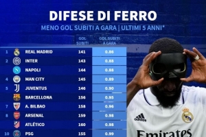 NBA直播11月15日讯 德国转会市场统计了2020-2021赛季以来球队在五大联赛中的场均失球,并列出场均失球最少榜单,皇马0.86球居首,国米、那不勒斯前三。