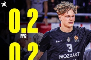 NBA直播11月17日讯 明年的热门新秀穆里宁截止目前为止,在欧篮联只出场4次,场均出场时间仅为1分55秒,而他的场均数据可以忽略不计,4场比赛合计就得到1分,场均为0.25分,也没有篮板、助攻进账。