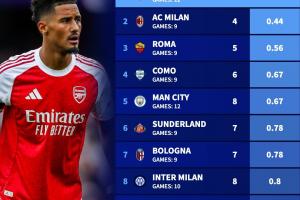 NBA直播10月22日讯 凌晨欧冠比赛阿森纳4-0完胜马竞,赛后德转官方统计本赛季五大联赛球队丢球最少榜,阿森纳12场仅丢3球排名榜单第一。以下是根据场均丢球数的排名↓