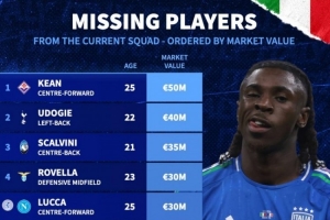 NBA直播11月18日讯 德转统计了缺席本期意大利队球员的身价并列出榜单,佛罗伦萨前锋小基恩5000万欧居首,热刺左后卫乌多吉4000万欧第二。