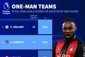 NBA直播11月18日讯 德国转会市场统计了球员本赛季英超参与进球数量占据球队总进球的比例,并列出榜单,哈兰德占比65%最高,塞梅尼奥占比53%第二。