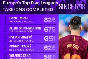 NBA直播11月19日讯 Squawka统计自17-18赛季以来,五大联赛球员成功过人次数,梅西以826次居首,圣马克西曼、姆巴佩排在二三位。