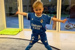 NBA直播11月19日讯 热刺中场麦迪逊在今日通过社媒晒出自己儿子的动态,后者穿上了贝林厄姆在皇马的5号球衣。