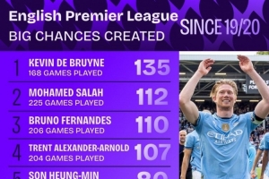 NBA直播11月19日讯 Squawka统计了2019-2020赛季以来球员在英超创造重大机会的次数,并列出榜单,德布劳内、萨拉赫、B费排名前三位。