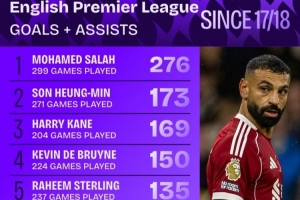 NBA直播11月19日讯 数据机构squakwa统计了17-18赛季以来的英超直接参与进球榜,萨拉赫断崖领跑。