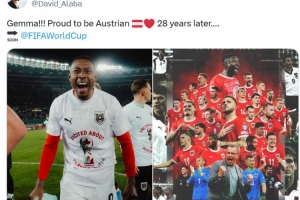 奥地利球员阿拉巴也在社媒晒出庆祝照片以及球队晋级海报,配文写道:“身为奥地利人我感到骄傲,时隔28年重回世界杯!”