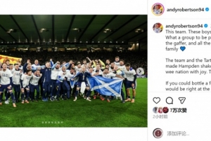 NBA直播11月20日讯 苏格兰队长罗伯逊更新社媒动态,表达了直通世界杯的激动之情。