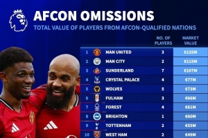 NBA直播11月21日讯 德国转会市场统计了英超各队将参加非洲杯球员的身价,并列出排名,曼联1.35亿欧居首,曼城1.15亿欧次席。