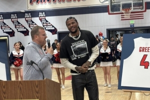 NBA直播11月21日讯 昨日,太阳后卫杰伦·格林的高中球衣退役仪式在圣华金纪念高中举行。