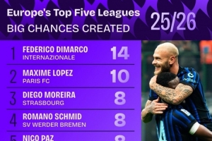 NBA直播11月21日讯 Squawka统计了本赛季球员在五大联赛创造重大机会的次数,并列出榜单,迪马尔科创造14次重大机会最多。